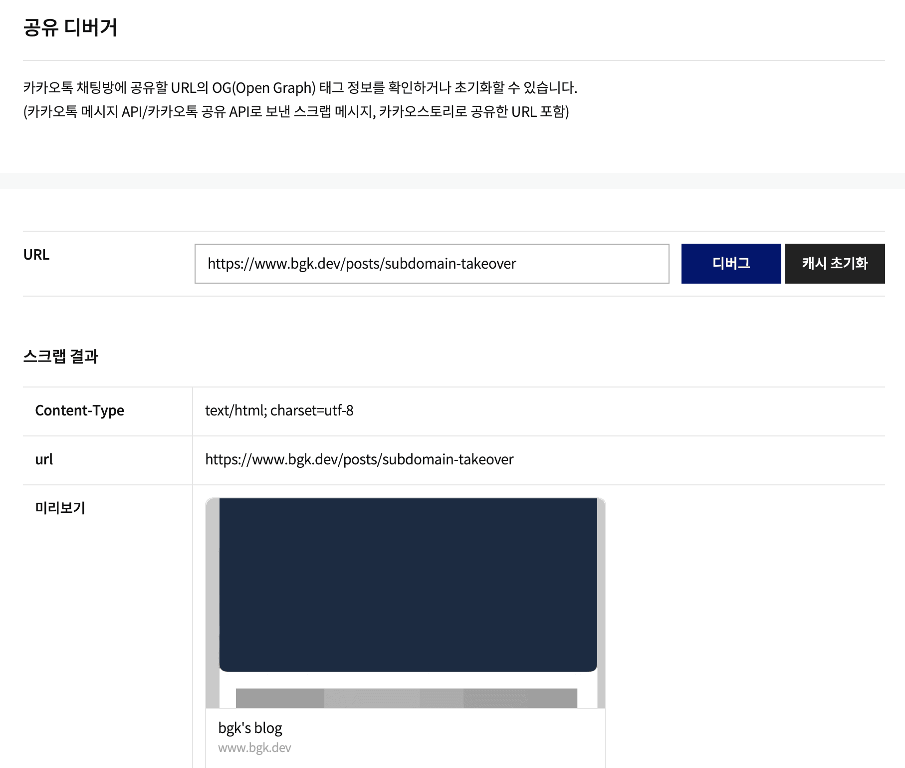 kakao developers 도구 > 디버거 도구 > 공유 디버거를 이용하면 된다는 것을 알게 되었다.